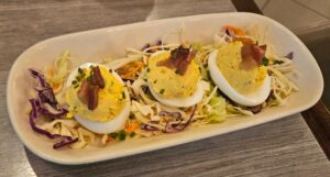 Lobster Tacos-(mango salsa, lime crema) delicious and Bacon Deviled Eggs ( brown sugar, Applewood bacon, tarragon and chives ( delish)and some amazing oysters- wow!