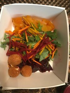 Our appetzers were “popcorn Cauliflower” ( evidently a house specialty- I can see why-DELISH), Nana’s Meatballs ( pork & beef, marinara, parmesan, bread crumbs, ricotta and garlic cibatta). They were terrific. Jane adores chips and guacamole, and found theirs to be as zesty and flavorful as any of the Mexican spots we have visted over the years.. We also had a few of their Tacos ( a puled chicken as well as one pork). If you come as a family, this may be perfect to order for the youngsters. They were wonderful. My opinion- Pork was better than chicken, BUT I am a pork lover. It is not often that I find a “beet salad” anywhere, so when I see it- I must have it, and if you love beets, you will be in heaven!