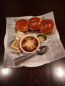 For our entrees we chose the Brisket Sandwich served on a french roll, their pulled pork sliders ( three juicy and delicious sandwiches) and a Reuben Panini (smoked pastrami, sauerkraut, Swiss cheese on rye bread- toasted to perfection. All of their “mains” come with fries ( if you say well done, you will see just how great a french fry can be), a cup of soup ( their soup is the chili), mashed potatoes, potato salad, a small salad or tater tots.