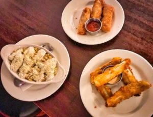 The starter menu ( perfect for sharing) is huge and we opted to do a few, since we wanted to do a true taste. We decided on the fried pickles served with a spicy ranch that truly made the pickle a special part of the evening. We also had the Brisket Mac Eggrolls- brisket  one of their truly specialty items( as they do their own meats),  an eggroll filled with mac ‘n cheese and brisket. WONDERFUL!, and for a third taste, the Street Corn Elotes- roasted corn kernels in a spicy mayo mixed with cilantro-lime juice and Parmigianino. There are many more items to choose from as this is a huge menu.