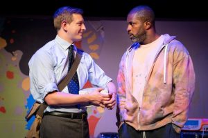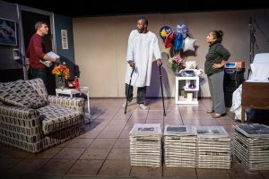 One of the problems with a small space is that the actors tend to think of the show as more a dialogue and fail to do something that I was taught back almost 70 years ago-“make sure that the back row of the theater can hear you). They failed to do so on a consistent basis . There were moments where they were more one-on-one , causing the audience members to strain or miss an important line. If you cannot mike the performers or the stage, they need to project. The words in this play are too important to miss!