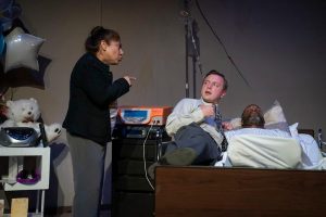 Directed by Jay Espano on a set designed by Foiles ( a unique work of art). The entire story takes place in Michael’s hospital room. Michael ( Marc Prince) When we enter the venue, Michael is on the stage, in the bed and “in a coma”. For almost 20 minutes of people entering the theater, he just lays there looking angelic in his sleep.