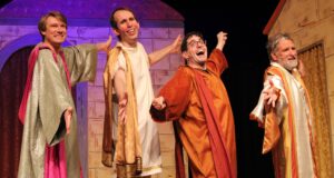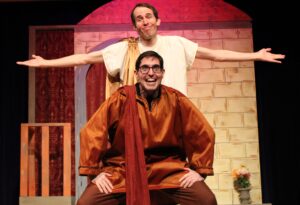 Design-wise, Claire Rockwell’s modular set fits the slapstick style perfectly, and Dame Erickson’s colorful costumes evoke the spirit of ancient Rome with a vaudevillian flair.