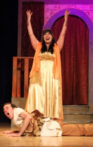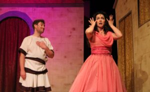 Daniel Leahy plays Marcus Lycus, the sly merchant of courtesans (yes, courtesans), and provides plenty of laughs with his exasperated antics. Senex’s domineering wife, Domina (Erin Renee Baumrucker) adds more fuel to the fire as she leaves town, demanding that house slave Hysterium (an outstandingly nervous Andrew Buel) keep their son Hero—and his virtue—out of trouble. Meanwhile, Erronius (Gayle Starr), the bumbling neighbor, is on a desperate search for her long-lost children, cursed to wander the seven hills of Rome endlessly.