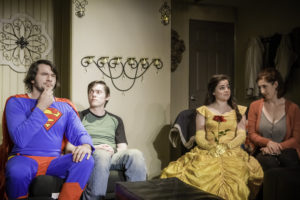 Like all of the film romances, these young people are destined to be together and it takes us two hours plus to get there ( with one 10 minute intermission). I think Riley might consider chopping this down to a 100 minute play with no break and the story could be more convincing. Mark is in love with his best friend’s wife. Ally is looking for love in all the wrong places and allows her terrible boyfriend ( Travis Monroe Neese plays raunchy to perfection) to keep abusing her. Ally has a roommate, Lucy ( Jaclyn Renae Jensen) who is stuck-up, snobby, beautiful and a true slut. She always gets the guy ( until the final scene, when all things come to an ending that will surprise some of the audience members).