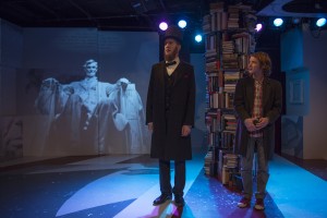 Meanwhile, in Springfield, Lincoln (Hosner) is living with a friend, Shua (Trumbly).  Because the two men shared a bed, Cal is convinced they were gay.  They stayed together until Lincoln decided to marry Mary Todd (Fisher).  When they moved to the White House, Mary frequently left on shopping trips to New York.  Lincoln frequently stayed in a cottage on the grounds of the Soldier’s Home with his bodyguard, an officer named Derickson.Nathan-Hosner-and-Matt-Farabee-300x200