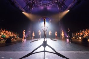 While this show is not up to what one might expect from a “cirque” event, the cast of gymnasts and circus performers is marvelous with great energy and talent that I am sure have been honed sincethey were babies. The music covers a wide range from hip-hop to romantic ( the hoop act was a beautiful love story performed by Sandra Ibanez Ramirez and Juan Carlos Acosta Morales ). The singers, Diana Particia Vargas Montoya and Juliana Valentina Toro Valesquez are charming and talented with beautiful voices. The entire troupe works hard to please an audience that is set up with cabaret tables on the main floor and then four floors of seating allowing the people on the 4th level to see right into the eyes of the aerialists during their acts.