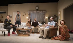 [rating=3] Another World Premiere in Chicago’s world of theater. This particular one, at Lookingglass Theatre was written by one of the ensemble members, Kareem Bandealy ( this is his first play and because of that, I will give him a bit more leeway than normal). The play is titled “Act (s) of God” and takes place in 2029, ten years hence, in an unknown or unnamed area that is near a railroad track. The home ( Brian Sidney Bembridge has designed a very livable living room and dining area- we never see the rest of this ranch home that seems to be in a deserted area) is where all of the action takes place. It is a special week-end. Father (Rom Barkordar truly is perfect in this role) a philosopher and very religious man who has stories about just about everything, and Mother ( an incredible performance by the always reliable Shannon Cochran, who even sings an “aria” to close out the first act) are awaiting the arrival of their children.