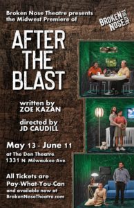 [rating=5]How do we form bonds and connect in uncertain times? What role should artificial intelligence play in our lives? To what extent should the government control the information we receive when survival is tenuous? These are some of the timely issues addressed in Broken Nose Theatre’s production of Zoe Kazan’s “After the Blast,” playing now through June 11 at the Den Theatre, 1331 North Milwaukee Ave. in Chicago’s Wicker Park neighborhood.