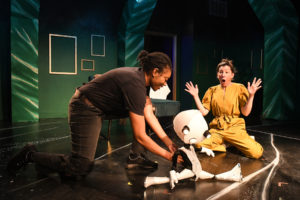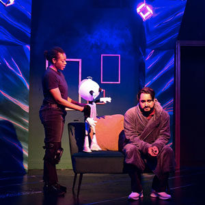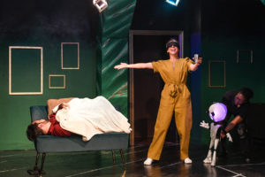 The show is set in the future—three generations following a nuclear blast which sent humans underground to live. Partners Anna and Oliver want to have a child (for which they need governmental permission), despite Anna’s struggles with depression. Anna’s and Oliver’s lives are forever changed when Oliver brings home a small “companion robot” which they name “Arthur.” In this production “Arthur” is a cleverly designed creation of Jabberwocky Marionettes. He is operated and voiced by Arielle Leverette. Ms. Leverette masters the robot’s flat speaking style, yet somehow imbues the character with a smidgen of charm which makes him endearing. It is no wonder that Anna (played with fierce intensity by Kim Boler) becomes attached to the little robot.
