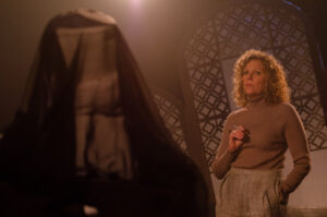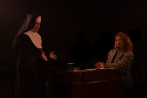 The simple but effective set design by Rose Johnson features skewed outlines of stained glass windows on the north and south sides of a small bowling alley stage. Clever props design by Evy Burch features a slanted office desk, intentionally shortened on one side, plus a distorted wire waste paper basket. Sam Anderson, the lighting designer, has provided just the right touches at just the right moments of the show, including the silhouettes in the background. Anna Bodell’s costume design is nicely done and appropriate for this story, particularly the two types of traditional habits, one worn by Mother Superior as a professed nun and the other worn by Agnes, the novice. Last but not least, Courtney Abbott has done a fantastic job as the fight and intimacy choreographer, an essential element for this production, where there is close contact among the actors.