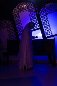 The weirdest part of the staging, however, was when mist containing incense came out of a hole on the underside of the crooked desk and rose to fill the entire room. I understand that fog can be analogous to the characters’ bewildered states of mind, and, of course, there is the traditional religious significance of the incense. But I happened to be seated right by the opening where the mist originated and became increasingly concerned that my breathing might become adversely affected. Plus, everything became needlessly foggy when far too much mist was being used in such a confined space.
