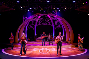 As I said, it is pretty much like a concert with our five performers using the stage to convey the story of a man who had a problem telling people what he felt in words, but was very able to do so with his songs. The design of this sort of bandshell ( but very rustic) by Ann Davis works. On the floor of the arch are the other musicians under the direction of Musical Director William Underwood. They are Alison Tatum who plays a mean fiddle and Chicago favorite Malcolm Ruhl who plays just about every instrument and will astound you with his harmonica solo. Wow!