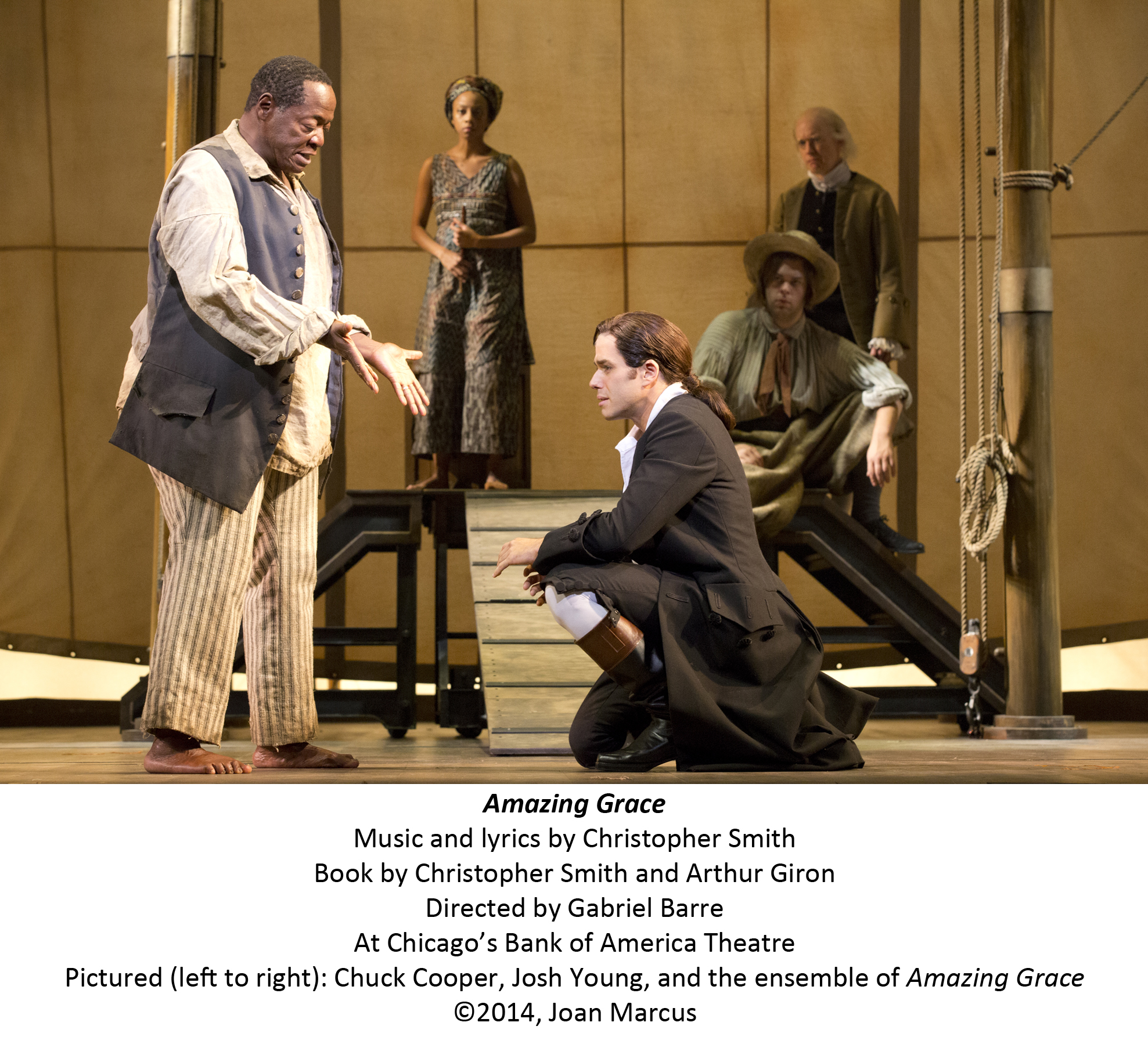 The time is 1744 and the place is England, but along the duration of the story, we travel the trails of our hero, John Newton ( a powerful performance by Josh Young who has a vocal range that is absolutely amazing). He has left the university and his easy life to come home and enter his father’s business, Slave Trading. As her tells his old schoolmate,Mary Calen ( deftly handled by Erin Mackey) who later becomes his lover, he is in business to bring to those who want an item, that item, so what he is doing is good for all concerned. Both John and Mary have had slaves, who helped raise them all their lives and know not of the suffering that bringing these people out of Africa has caused to their families. John’s Negro is George ( a dynamic portrayal by Chuck Cooper) and Mary’s Nanna (Laiona Michelle). As the story unfolds, we learn a great deal about them and what they lost when they were brought to England to become slaves.