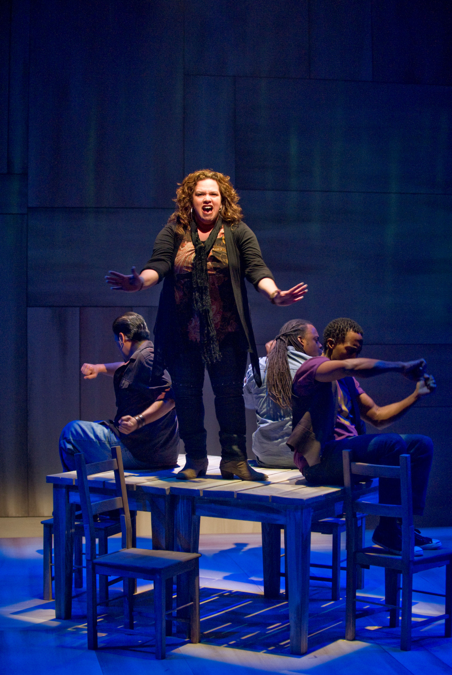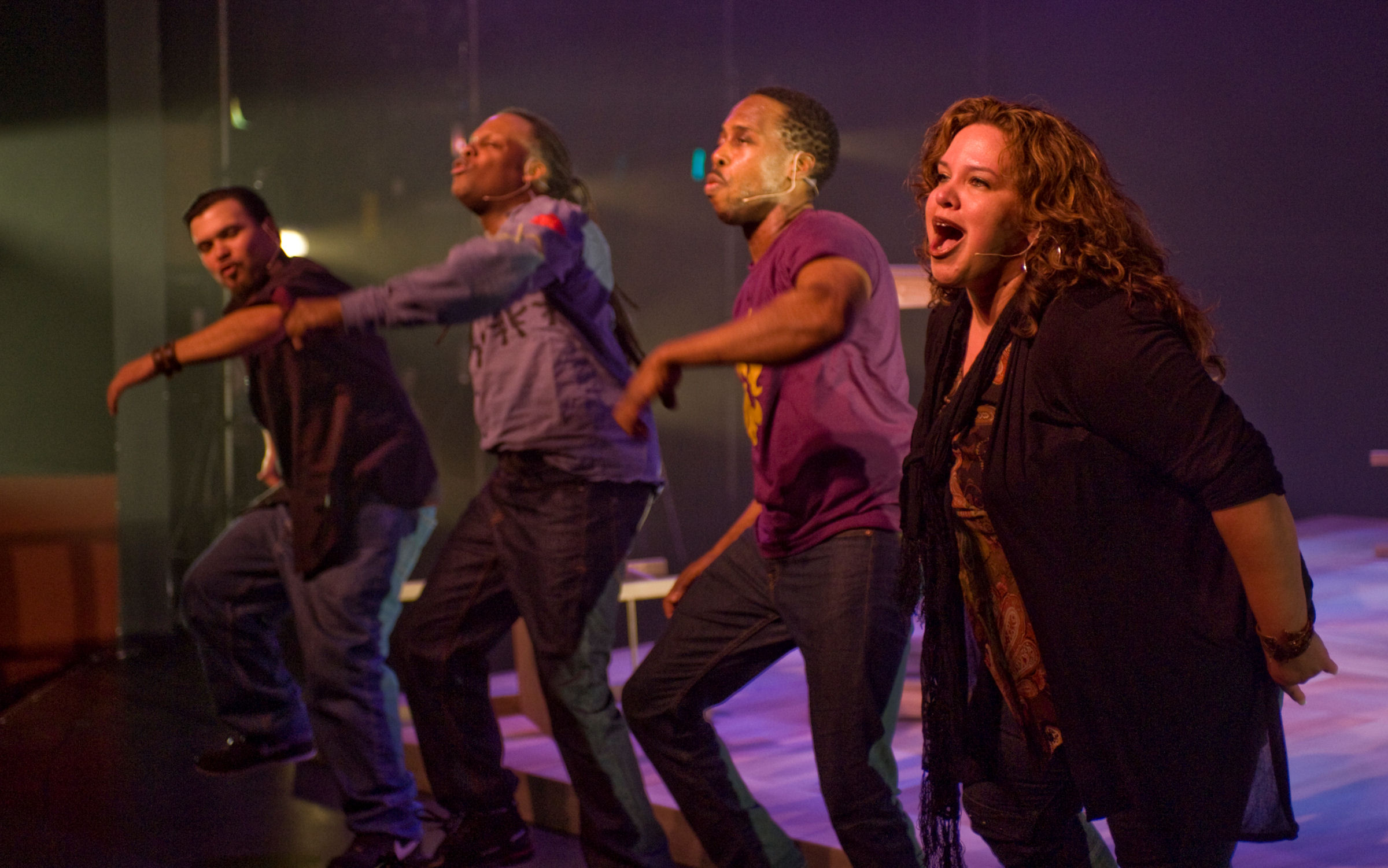 Set on a fairly blank platform stage with a backdrop designed to bring projections to our eyes (designed by Brian Freeland)that will add further dimension to the words of the four actor/performers on the stage.What begins with Katrina and the question of “If this were to happen again, would we be ready for it?”. In fact, the entire 90 minutes takes us to places where most of us fear to tread- Race, Immigration,Prejudices, hate, religion, guns laws and almost every topic that one might avoid looking at on a daily basis. Directed by Yew and choreographed by Millicent Johnnie, the scenes move quickly from New Orleans to other major cities and the topics are highlighted by projections of statistics that are somewhat alarming.