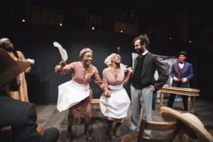 There are also three “house” slaves, who represent the comic relief while at the same time illustrate the struggles of the period (and in reality hit on some of the things in our world even today-that is what satire is all about). They are Minnie (Sydney Charles is adorable), Dido ( Maya Vinice Prentiss is hysterical) and Grace ( Tiffany Oglesby funny as all get-out). The other two members of the cast are what one might call the “white ensemble”, two men who play Ratts ( Kelson McAuliffe) and playing a multitude of roles, Christopher Sheard ( a very agile young man).