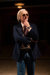 The story takes place in 1976, at a time when Warhol had become the artist of the “rich and famous”. He is in his hotel room ( a solidly designed room by Todd Rosenthal) in Iran. He is there to meet the Shah of Iran and photograph his wife for a formal portrait. At the very onset of the play, Warhol is NOT on the stage. In fact, he enters from the audience section of the theater, stopping to chat with us. In the role of Warhol is Rob Lindley. I have always thought him to be a strong talent, but in his creating Warhol he has far exceeded my expectations. He is amazing. He plays with us, the audience, for a few minutes and then seeing as if he doesn’t go on with the story, people will ask for their money back, states that he hates giving money back, so he will tell the story.