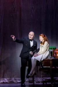 **** I am unsure as to the number of times I have either seen, been in , or participated in the musical “Annie” based on the cartoon character, “Little Orphan Annie”. I have played F,D,R,, been an ensemble member, and a few years ago, when my “grand-dog” Benji played Sandy at Glenbrook North High School, I was the back stage helper to make sure that he showed up onstage at the right times. I love the story and the music, so in spite of packing to leave on my first cruise ( ever), I made sure that I was in the audience for the production of “Annie” at The North Shore Center For Performing Arts as done by Music Theatre Works.The performance was in fact, the last “preview” so there were still items being worked out and I would think that by “opening night” they fixed a few of the items. I must say that the direction by Kyle Dougan-LeBlanc was very special. Those of you who read my reviews and hear me on Sundays at WCPT know that I am consistent about ” every production of the same play being different”, and this one proved my point. Kyle found a way of adding film to the story, allowing them to have interlude music while they changed the set ( well done by the Penrods). The only problem seemed to be the stage left area where people seated in the left aisle just might get a backstage glimpse. If you are watching this cast doo their thing, that won’t bother you- they are energetic and the voices are powerful.