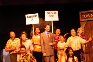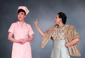 The story is about a small town, its corrupt Mayoress Cora Hoover Hooper ( well played by Sarah Saperstein) who along with her cohorts provides a fake miracle to attract tourists and keep the coffers full. In the community there is an asylum called The Cookie Jar and one of the nurses, Fay Apple ( deftly handled by LJ Bullen) shows concern. When a new “doctor” comes to town everything becomes “shook-up”. We learn that the “doctor” has his own secrets. “Doctor” J. Bowden Hapgood ( well played by Evan B. Smith) becomes the love interest for Fay Apple as we watch the two of them transform the town and its inhabitants. While the show is one that is hardly ever done, some of the musical numbers are ones that we hear on specials done by Sondheim lovers Bernadette Peters and Mandy Patinkin. By the way, this musical was Ms Landsbury’s first musical and led the way for many success stories for this Broadway favorite.