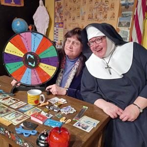 There newest show by Vicki Quade also stars the M.C. Nancy Greco, is loosely based on the TV show Who Wants to be a millionaire but is more like Who wants to get out of Purgatory. The show takes place in a reconstructed schoolroom that you would have found in most Catholic schools in the 40, 50, and 60’s. Set Designers Scott Flores and Jason Shivers, did an excellent job recreating this, down to the faux linoleum floor.