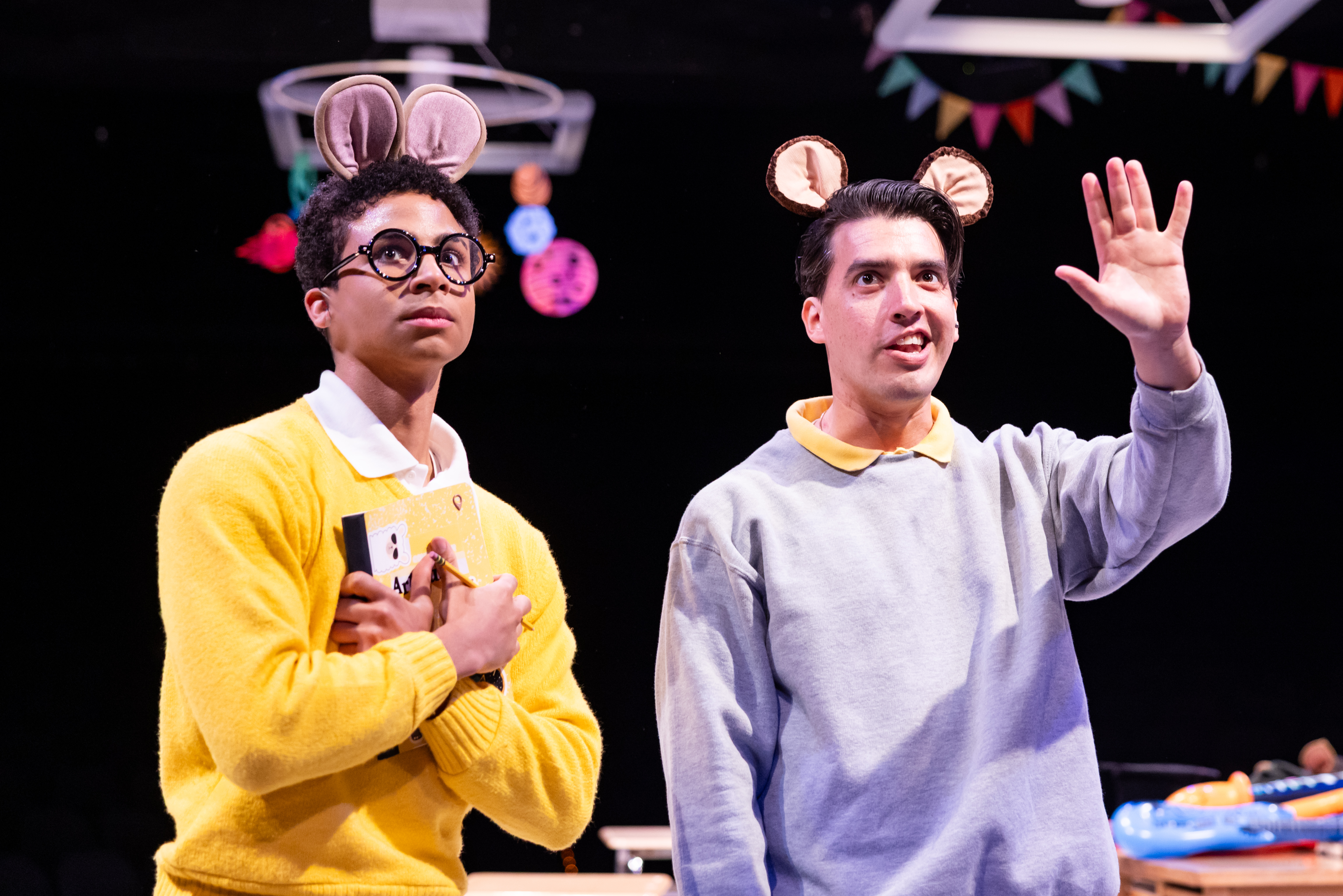 Most of this cast are new to Marriott Theatre. I recognized a few, and it is great that this theater continues to find young talent to grace their stage. I have been attending this venue even before it was Marriott ( the original venue was Drury Lane North, and they did non-musicals) and have watched a great many performers get their start on this stage. Let’s welcome these actors as well: The teacher, Mr. Ratburn ( Ron King) , classmates  DW ( Joryhabel Ginorio), Buster ( Garret Lutz), Francine (Danielle A. Davis, who also plays Mom), Muffy ( Arwen-Vira Marsh), and Brain (Andres Enriquez, who also plays Dad). They were all terrific and each one had their own shining moment.