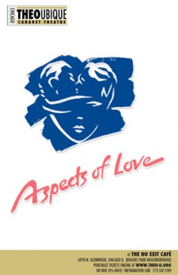 [rating=4] We have all heard the expression “good things come in small packages”, I am sure. I find this statement to be one of the best descriptions of the productions that are offered at TheoUbique Cabaret Thetare, that little treasure up in Rogers Park where we are offered some of the best talent in Chicago in one of the most intimate of spaces, No Exit Cafe. Yes, in this little storefront theater ( which was a coffee house back in THE day, we get productions of “Evita”, “Cats”, “Chess”,”Light in the Piazza” and now, a show that fits perfectly in this space, Andrew Lloyd Weber’s “Aspects of Love”. This is a musical piece that was meant to be a chamber musical, but since it was a Weber product ( although the lyrics were written by Don Black and Charles Hart) it was made into a huge, glitzy Broadway style production. DING!DONG! That was a huge mistake. It has since been retooled, after its Broadway failure, to chamber musical, but even then, no one in Chicago ( a very savvy theater town) has ventured to do this mini-musical. That is until Fred Anzevino, Artistic Director of TheoUbique took another look at the fit it would be for his intimate space on Glenwood Avenue. It has been over 10 years since we have had an opportunity to see “Aspects” and Anzevino’s production is one that should garner his company some more Jeff Awards to add to their trophy case, and may I say, well deserved.