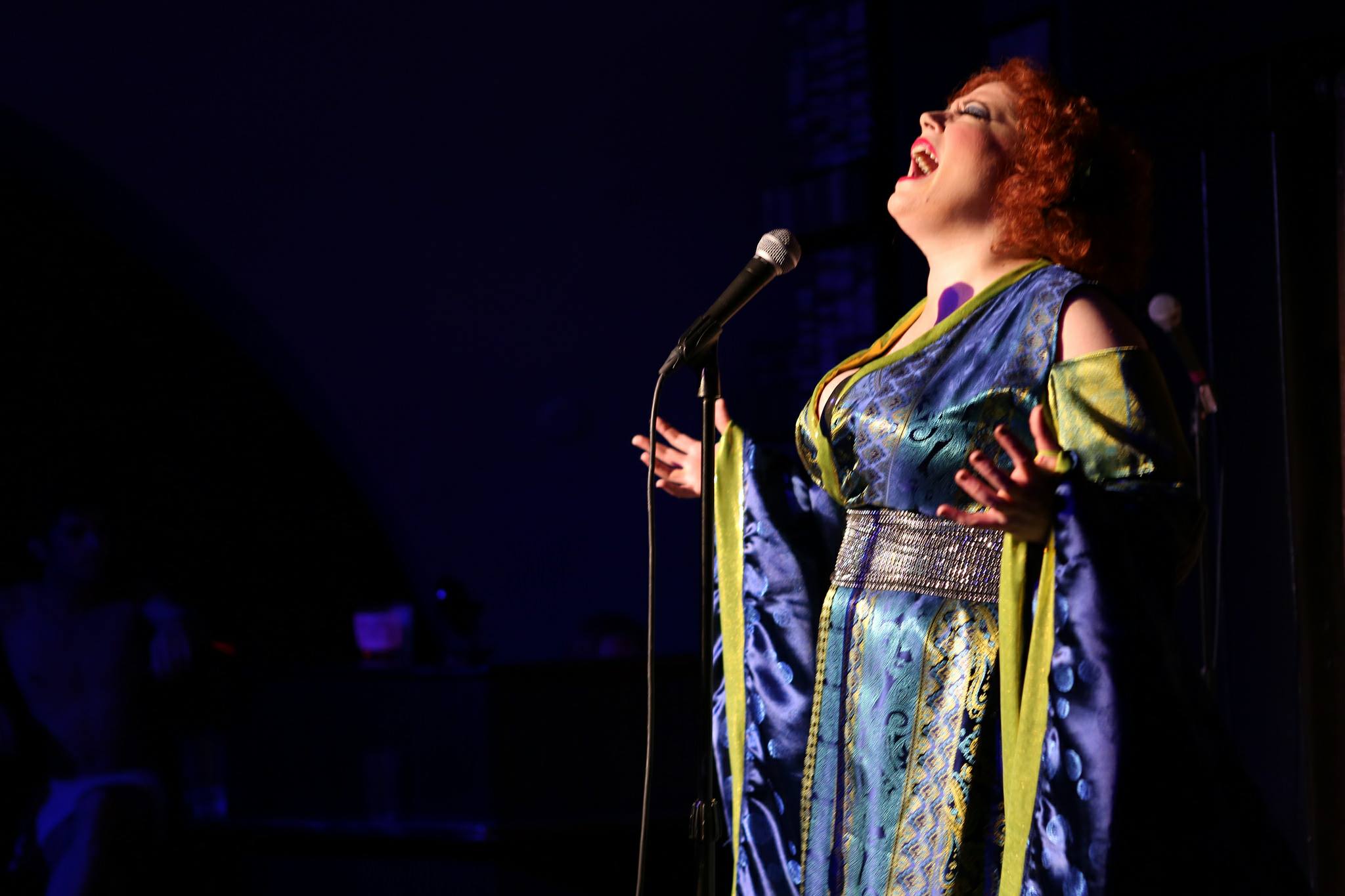 Which “Schvitz”/bathhouse is this production at? It is at Mary’s Attic upstairs of Hamburger Mary’s locate at 5400 N. Clark Street in Andersonville. I must say, watching the diners IN the restaurant eat those burger and onion rings on the way in, really made me think, I am missing something here, so next time I come here, I am coming early to taste the vittles. Once you get upstairs (use the powder room in the restaurant first as there is none up in the attic) you will find that you are now in the steam room that represents Miss M’s start. The steam however comes from the talent that is on the stage and while it seems odd for an 80 minute show to have an intermission, I can understand Ms Jackson needing a break for her voice and to make sure she is fully in her costume.betteonstage