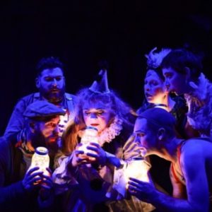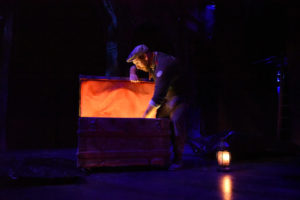 We delight in being entertained by the vaudevillian troupe. Leah Urzendowski is amazing as Nellie Reed. She is bold, brash, and authentic, and the stage lights up whether she takes charge. She explains her life history of wanting so badly to move from her small rural town to the big city lights of Chicago and become an acrobat. Equally forceful and dynamic is Pamela Chermansky, who gives an extraordinary performance as the Fancy Clown, who cajoles and lectures us. Ryan Walters plays Eddie Foy, the comic actor who had once told the original attendees to calm down and stay seated; everybody looked to him for guidance when the fire first began. He insisted that the fire curtain would come down; but instead, it got stuck: on who knows what? With people screaming, clawing, and begging in the aisles, you can imagine his guilt for not demanding that people immediately leave the theater. Anthony Courser (Henry Gilfoil) is the actor who recreates Bluebeard, while Jay Torrence (Robert Murray/Playwright) explains how his role was that of the backstage manager, one of the first to know that the odd lighting was not a special effect. Crosby Sandoval, as the Faerie Queen, is the only fantastical character who, both in the present-day and the past, does not utter a single word.