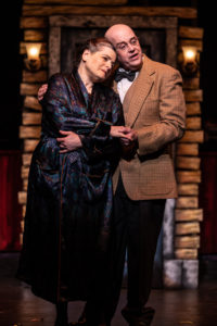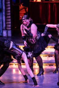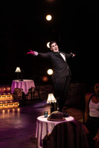 Costumes are superior in this production, thanks to the fine work of Samantha Sharp and Mary Baca. While each and every garment is fantastic, one of my personal favorites is the slinky black dress with the diagonal diamond trim and chiffon and the red feathered boa that Sally Bowles wears, and also the red dress while she sings the highly recognizable title song “Cabaret” in the second act. The cabaret singers and dancers are beautifully garbed and coifed, adding to the entertainment value of the show. The set by scenic designer Eric Luchen is creative and versatile and works especially well for the rooming house scenes. I especially liked the moving props by Patrick McGuire and Kelly Neuls that allow the actors to shift scenes quickly and convincingly, such as being inside a performance hall to being inside a train car to being outside the rooming house. And of course, the music is fantastic! The orchestra is made up of musical director Hartge (piano/conductor), who is also the sound engineer, plus Ryan Adams (trumpet), Sophie Cruetz (reeds), Anthony Scandora (drums), Mike Lockler (guitar/banjo), Bobby Dietz (keyboard), and William Kort (trombone). I loved how the graphic artist beautifully coordinated shades of purple, hot pink, gold, and seafoam green on the posters, online programs, and other publicity for “Cabaret”, not to mention the other shows being featured by the Metropolis Performing Arts Centre this season.