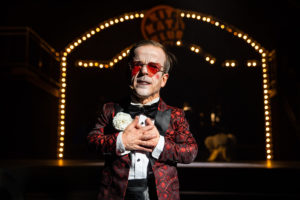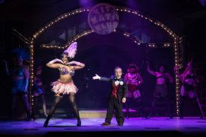 Clifford is introduced to the Kit Kat Klub where he meets a little bit of everything that Berlin had to offer at the time. There is a character, The Emcee at the club that most of the world associated with Joel Grey who did the Broadway production and the film version. Weber, in doing his research, found that the character is referred to as the “little man” so he opted to play it that way, bringing in the spectacular Josh Walker to play this role. There is an old saying that “good things often come in small packages”. Walker proves that to the nth degree! He is powerful, dances a storm, plays off the audience ( we sat in the first row) and is a definite Jeff nominee.
