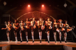 It is Berlin in the late 1920’s heading into the 30’s. Our main character, Clifford Bradshaw ( a powerful performance by Gilbert Domally), an American, is in Berlin to write his novel. On the train he meets a German, Ernst Ludwig (Josiah Haugen) who helps him find his way. Later, we will find that Ernst is a member of the Nazi party. Clifford is an unusual character and while most renditions of the show indicate his bi-sexuality , Weber truly shows us the true character. This is a gutsy move, but well directed and acted making it feel comfortable for audience members to absorb and understand.