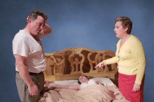 The second scene in this act, “Visitor from Philadelphia” is top-notch, filled with some great physical comedy touches. The scene opens with Marvin ( a solid and very comical performance by Tim Walsh) waking up from what appears to have been a wild night. In the bed, next to him is Bunny ( a solid performance by Katie Incardona, who truly proves that there are no such things as “small parts”). Neither of them knows what took place “last night”, but Marvin’s wife, Millie ( solidly played by Nancy Greco) is on her way up to the Suite. They are in town for their nephew’s Bar Mitzvah, which makes the outlandish situation and events from the previous night that much funkier. This scene is a HOOT and well worth the price of the ticket on its own.