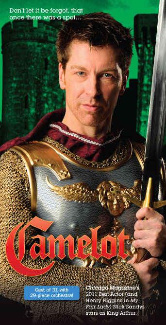 Highly Recommended**** How fortunate are Chicago area theater audiences to have a company like Light Opera Works, a musical theater troupe that brings us superb productions each year- classics, redefined with dynamic casts made up of Equity and non-Equity players, who share one common goal; to bring us the best musical theater, with full orchestra in a comfortable setting and of great importance, affordable ticket prices. The only drawback this company has, if one can call it a drawback, is that they can only offer us limited run times due to the large expense of giving us a full orchestra. Currently, Light Opera is doing “Camelot”, the wonderful story of King Arthur with a book and lyrics by Alan J. Lerner and music by Frederick Loewe ( the creators of “My Fair Lady”) and one of last year’s hits at Light Opera. Director Rudy Hogenmiller, who did that one as well, was smart enough to snag Nick Sandys ( who played Henry Higgins) to take on the daring role of King Arthur and succeed he did. Over the years, Sandys has shown the full spectrum of his acting abilities; a great dramatic actor, a many for all seasons when it comes to light comedy and wit and now, he shows off his triple threat capabilities as a song and dance man- and he does it all with panache!