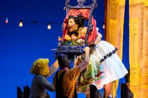 Pagliacci has a lot more action than Cavalleria, and this production adds non-speaking clowns to provide circus-style spectacle. It also depicts love and violence onstage instead of just describing it. Sutliff’s Silvio is a dashing but sensitive figure in his proto-greaser get-up, and Reyes’s Nedda is magnetically erotic both when she’s in and out of her clown persona. Kelsey’s Tonio, like Canio, chafes at how near the treatment of his character comes to his insecurities. As a disabled actor, Tonio’s role in the comedia is to be hissed and jeered at for thinking he’s worthy of a sexual relationship, and when his fragile ego is threatened by Nedda rejecting him backstage as well as before the audience, he needs to get Canio to kill her for him because he’s unable to overpower her himself. (Side note: I was struck by what an odd idea the residents of this town have about what kind of play is appropriate or enjoyable for children. When they realize Canio is serious about killing his castmate and someone in the audience, they chase the kids out of the front rows but otherwise just gawk.)