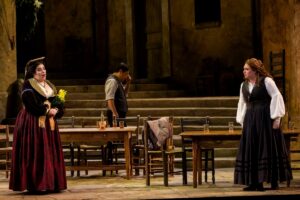 In the play’s social context, it is almost certain that Turiddu was conscripted, that Lola married Alfio out of financial desperation, and that if Santuzza were not the viewpoint character, their situation could have been depicted much more sympathetically. But without that context being explicitly stated, the characters’ plight appears to be caused by their own immaturity. SeokJong Baek is a youthful and powerful Turiddu; he rolls in like a thunderstorm and clashes mightily with Kelsy’s older, more self-assured Alfio. Matochkina’s Santuzza is a sweet, contemplative, but naive girl, who despite her anger at Lola and Turiddu, is able to describe their situation in a straightforward manner and attempts to win back Turiddu’s passion with reasoned arguments. Moshinsky/McClintock’s direction has her meandering about the stage yearning for most of the run-time, her isolation standing in contrast with the very communal chorus, who are all quite busy hanging up decorations and celebrating Easter. Decker’s Lucia is a delight, always huffing and fretting, giving orders and carrying out her duties as a hostess. Framed by Michael Yeargan’s set and costumes, she truly seems a vision from another place and time.