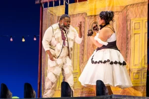 This production’s Pagliacci is set right after the end of World War II, when it really has been a long time since the comedia troupe last was in town. The ultimate play about actors who got too wrapped up in their roles, it depicts a group of clowns led by Canio (tenor Russell Thomas) who perform skits in which Canio’s wife, Nedda (soprano Gabriella Reyes), cheats on him with Beppe (tenor Daniel Luis Espinal), while rejecting the advances of Tonio (also played by Quinn Kelsey). In truth Nedda really is having an affair with a local man, Silvio (baritone Luke Sutliff), despite, or perhaps because of, Canio’s obsessive jealousy and hair-trigger temper. One might wonder why Canio chooses this as his troupe’s subject matter if he is that insecure, yet, when a man jokes to Canio that Nedda might betray him for real, Russell Thomas’s sardonic smirk before Canio violently intimidates the man into apologizing suggests that having an excuse to threaten people who laugh at him is Canio’s reason for playing the clown.