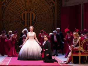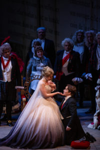 We begin with a chorus of servants skittering around the house of Pandolfe (Derek Welton), and his new wife, Madame De la Haltière (Elizabeth Bishop). He chose poorly, and the servants let him know it. He concedes his complicity in his opening aria and wishes his daughter, Lucette (Siobhan Stagg) was treated better, but feels helpless. Of course, we know that she also has a fairy godmother (Marie-Eve Munger) who will conduct her to meet Prince Charming (Alice Coote), but this fairy desires them to make a slightly more substantial connection than is typical in Cinderella retellings. Lucette would like a mended relationship with her father, too, if he can deserve it.