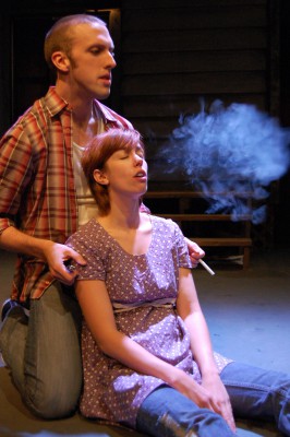recommended In this Holiday season, one where many of the local theaters feel the need to present “holiday themed plays”, it is inspiring to see some of the more adventurous companies bring us stirring new dramas. The Side Project Theater Company, a true storefront theater located in Rogers Park kicks off their season with such a production. A play written by James McManus called “Cherry Smoke”- one hour and forty minutes of intensity ( no intermission) about two brothers and the women in their lives. Fish ( a powerful performance by Dan Toot) is a fighter. His father raised him to be a man and to punch until you cannot punch any longer, and then keep on punching. Set in a poor steeltown somewhere in America, “Cherry Smoke” takes us on a ride that has many ups and downs as we see that Fish and his younger brother Duffy ( another super character portrayal by young Peter Oyloe) are left to their own defenses. Raised by their dad who left them very little in either education, property or love and understanding, we see that Fish , from his childhood on, had to fight- no matter where and Duffy was his ward, his kid brother that he defended and cared for.