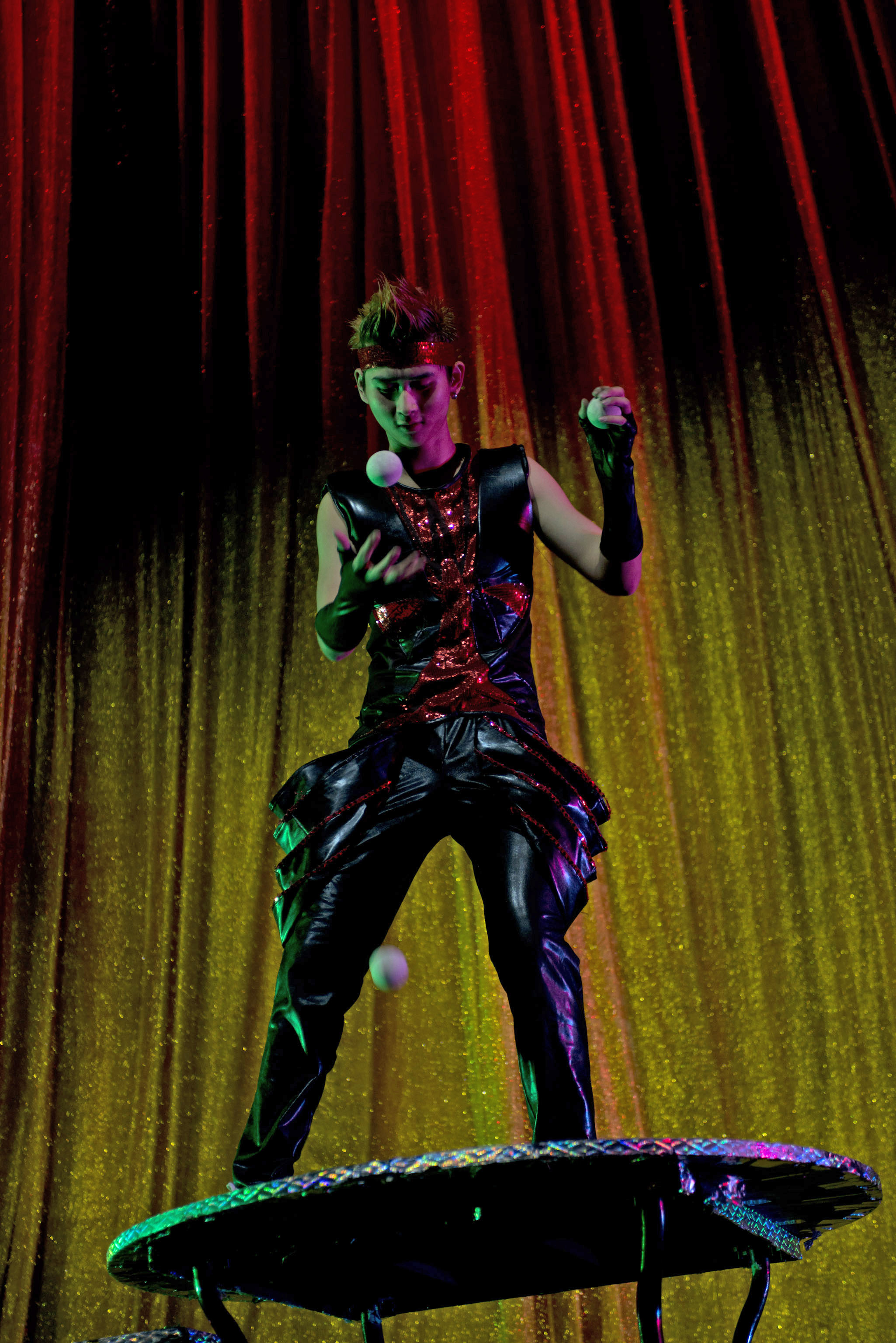The chair stack, in this production , is not one woman, stacking chairs and climbing higher and higher, but five women and the chairs are at an angle! Again, an extraordinary look at something we have grown used to, but with a new touch bringing the audience an eyeful. The Rolla Bolla routine- where a can holds a board and the performer balances, is another twist. Using an audience member, our performer has some fun as he gets the audience member to place items on the board and then flips them into the air to land in a bowl that he has flipped onto his head- amazing.