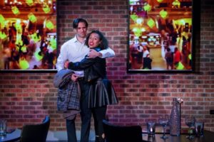 Directed by Walter Stearns, who designed and built this venue with shows like this in mind, we find that no matter where you sit, you never miss any of the action. The action is amazing, with some tricky dance routines ( choreographer Aubrey Adams does a great job) and Eugene Dizon handling the musical score with his other musicians ( Dan Kristan on Bass and Cara Hartz on reeds). Dizon is at the keyboards , of course. Robert Kuhn’s costumes are cute and very New York “chic” and Alan Donanhue’s set design, while limited due to the space, is functional and works! The powerful projections (Liviu Pasare) are well done, so pay attention to the four large wall hangings. They may look like works of art, but they are instead a part of the play.