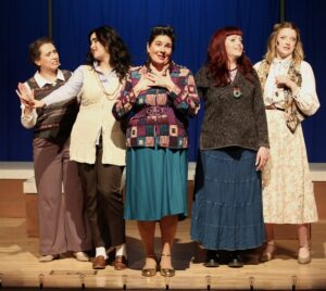 As for this particular production at the Skokie Theatre, the best part is the music and the live orchestra, made up of Jeremy Ramey (conductor/keyboard), Jeff Smith (bass), Adam Nigh (reed doubler), and Healy Hurst (drums). The singing and dancing are generally good. Sound design is excellent (if not a bit too loud), thanks to Elijah McTiernan in conjunction with Concert Sound Systems. I particularly liked the canned music at the top of the performance, like Frank Sinatra’s “I’ve Got You Under My Skin” (1956) and Elvis’s “Can’t Help Falling in Love” (1961), which grounds the performance and tells us something about the time period. Costume design by Kasey Wolfgang is appropriate for the era. Bobbie’s sweater with the horizontal stripe works well, and I especially liked April’s costume of red, which makes her stand out among the characters.