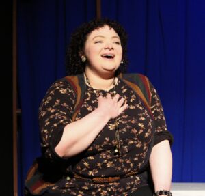 I realize that set design was intentionally minimalistic and innovative when “Company” was originally staged on Broadway: the point of which was to emphasize Bobby’s isolation. Unfortunately, at the Skokie Theatre, the set is so minimalist to the point of looking very amateurish. Although the scenes shift from being on a terrace to being inside an apartment to being outdoors, etc., it gets tired fast when all we see are blue curtained panels and a floor consisting of several raised wooden platforms of various heights. To put this another way, the set looks so cheesy so as to be laughable. On opening night, for example, there was one moment when Bobby’s girlfriend states that his apartment is beautiful with all of his masculine-looking furniture—and there was a bit of a snicker coming from the audience, considering that (with the exception of one bookcase) there is no furniture on stage. Also mildly comical was when the curtains parted at the Entr’acte to reveal the orchestra, followed by the conductor drawing them back together again. Even having a black scrim with the orchestra behind it would have worked better, because it would have given the audience something to look at and remark upon. The only thing that distinguishes the performance is a silhouette directly above the stage with an image of the New York City skyline. Even that could have been done better, as my guest thought it looked like a ship in a harbor rather than a series of buildings. While lighting helps to demarcate scenes, this becomes insufficient over time as the same barren set keeps getting reused. Missing from this production is a much wider stage so that actors could comfortably move from one (sparse) room to the next, thus allowing the audience to better distinguish among locales.