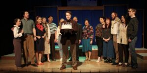 The friends who have organized Bobby’s surprise party are made up of several couples: Sarah and Harry (Sarah Sapperstein and Conner H. Schroeder), Susan and Peter (Fatima Zahara and Aidan Sternberg), Jenny and David (Jenna Smith and Elijah Warfield), Amy and Paul (Jamie Todd and Gabriel Reitemeier), Joanne and Larry (Rena Ahmed and Aaron J. Godwin). The girlfriends whom he has been dating include Marta (Anna Seibert), Kathy (Kelly Killorin), and April (Natalie Pearl Evans). And I liked the ending where Bobby can finally blow out all the birthday candles on his cake, because his wish has finally come true! (But now you have to see the show to see what that wish is!)