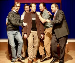As for this particular production at the Skokie Theatre, the best part is the music and the live orchestra, made up of Jeremy Ramey (conductor/keyboard), Jeff Smith (bass), Adam Nigh (reed doubler), and Healy Hurst (drums). The singing and dancing are generally good. Sound design is excellent (if not a bit too loud), thanks to Elijah McTiernan in conjunction with Concert Sound Systems. I particularly liked the canned music at the top of the performance, like Frank Sinatra’s “I’ve Got You Under My Skin” (1956) and Elvis’s “Can’t Help Falling in Love” (1961), which grounds the performance and tells us something about the time period. Costume design by Kasey Wolfgang is appropriate for the era. Bobbie’s sweater with the horizontal stripe works well, and I especially liked April’s costume of red, which makes her stand out among the characters.
