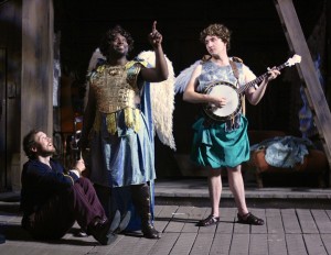 This is a fine production with a large and capable cast, some of whom double-up and play instruments during the musical numbers. Andrew Behling plays the banjo as the wicked Queen’s comical and inept son Cloten and Skyler Schrempp plays the fiddle as the honest servant Pisania. James Earl Jones II provides his powerful baritone as the nefarious Iachimo and the Angel Gabriel. The rest of the performers include: Lia Mortenson as the Queen, Robert Tobin as General Lucius, Tyler Rich as Polydore, Ryan Czerwonko as Cadwal, and Victoria Blade as Cornelia. The ensemble of Kelly Elizabeth Baskin, Andrew Coil, Lauren Demerath, Michael Ferraro, Royen Kent, Kate LaConti, and Tyler Thompson add depth and their voices in support.