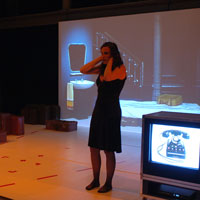 Salomee Speelt is a fixed-fluid collective founded by Noemi Schlosser. The company works to surprise both the audience they serve and in some cases, even themselves. ShPieL-Performing Identity is an incubator and producer of theater works dealing with identity, heritage and culture. It is very fitting, since they share a somewhat common ground that these two are currently producing two plays at Theater Wit on Belmont. The plays are very different- the first one that I viewed tonight is “Sound of Silence” written by Ms Schlosser based on the original work written by Jean Cocteau as a showcase for the famous ( or perhaps infamous) Edith Piaf. This is a one woman show that has been modernized from the 1940’s version with the sue of multi media, some of it brilliant and some of it confusing. The story is about an attractive nightclub singer ( played beautifully by Ms Schlosser who is one very sexy woman) who confronts her cheating lover who via video projection ignores her every word and action. This is a powerful study of a woman who despite her love for her lover, feels nothing in return. He is evidently a “player” using the money she earns to wine, dine and bed these other ladies. This is a one hour story that has some very bright spots, one of which the beauty and control of Ms. Schlosser. Some of the suitcases and boxes with TV monitors are quite confusing and caused those around me to lose focus at several points. This is a play that could be reworked into a 90 minute one woman show without all the extra “stuff” and truly showcase this fine playwright /actress.
