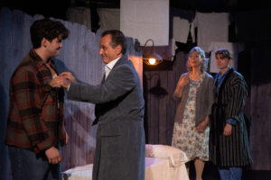 R. Slavick’s Charley, the neighbor and true friend, provides the calm voice of reason and compassion Willy desperately needs. Though the role isn’t fully fleshed out until the second act, Slavick grounds his scenes with quiet dignity. Terrence Mayfield shines as Charley’s son Bernard, whose success serves as a stark contrast to Biff’s failures — a reminder that hard work and education can pay off, even if the Lomans can’t see it.