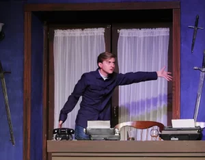 Sidney and Myra live next door to a psychic named Helga Ten Dorp (played by BEKA, who is a real stitch with all her intentional overacting). Helga says that she sees pain; she sees death; she sees all sorts of horrible things happening to people—and the Bruhl’s house seems to hold all these bad vibes. But does she get it right? And later on in the show, we are introduced to Sidney’s attorney Porter Milgrim (Aidan Steinberg), who is also an aspiring playwright, writing a script about Felix Frankfurter, entitled “Frankfurter.” Just like Bruhl’s last attempts, apparently this script is not a wiener (pun intended). I don’t want to reveal too much more about “Deathtrap” or the play with the exact same title that this show revolves around. But I do need to mention that the tension that the audience experiences due to threats of violence and depictions of actual violence is palpable, and Christa Retka has done a great job imparting this emotion to all of us through wonderful stage direction. What I liked best about this production, however, is how well the various actors die on set and how “lovingly” they are assisted in doing so. (Did I already say too much?) Such realistic depictions of violence could not have been done any better, thanks to fight choreography by Brian Plocharczyk and intimacy direction by Paige Klopfenstein.