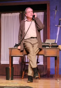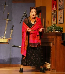 Set design by Brian Wasserman is fantastic. We see marine blue walls, French doors in the background, a fireplace, plus furniture such as a desk, chairs, and a settee to make for a realistic-looking office/sitting room. There are two tall bookcases containing glasses and liquor bottles, not to mention books—and a skull on one of the shelves. We see manual typewriters and a black dial telephone and discussions about carbon copies and broken Xerox machines, circa the early 1970s. (The play was written in 1978.) As alluded to earlier, nicely unusual is the room’s array of swords, knives, and other weaponry attached to the walls, including a pair of handcuffs supposedly once worn by Houdini for an act years ago—with a Houdini poster to match. Costumes by Wendy Kaplan are appropriate for that era, but most notable is BEKA’s whimsical and timeless Eastern European costume, characteristic of a quirky clairvoyant. Lighting design by Pat Henderson is exactly what it needs to be for such a small stage.