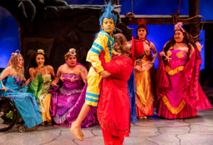 The story (book by Doug Wright, music by Alan Menkin, lyrics by Howard Ashman and Glen Slater) is based on a Hans Christian Anderson story and follows the adventures of Ariel, the youngest daughter of King Triton, King of the Sea. Ariel has several “critters” as friends—Flounder the fish, Scuttle the seagull and Sebastian the crab. She falls in love with the handsome Prince Eric. She also has to contend with the evil Sea Witch, Ursula. The 23-member ensemble cast is vocally outstanding, and choreographically well-matched. Although Joselle Reyes as Ariel is technically the “star” of the show, she is a gracious member of the ensemble. Just a few of the standout performances were Caroline Lyell as a deliciously evil Ursula; Gus Francere and Anakin Jace White as Ursula’s slimy henchmen, Flotsam and Jetsam; Clayton Cross (Dance Captain) as the klutzy Scuttle; Wesley Anthony Clerge’ as the jolly Sebastian and newcomer Eloise Mulliken as the adorable Flounder.